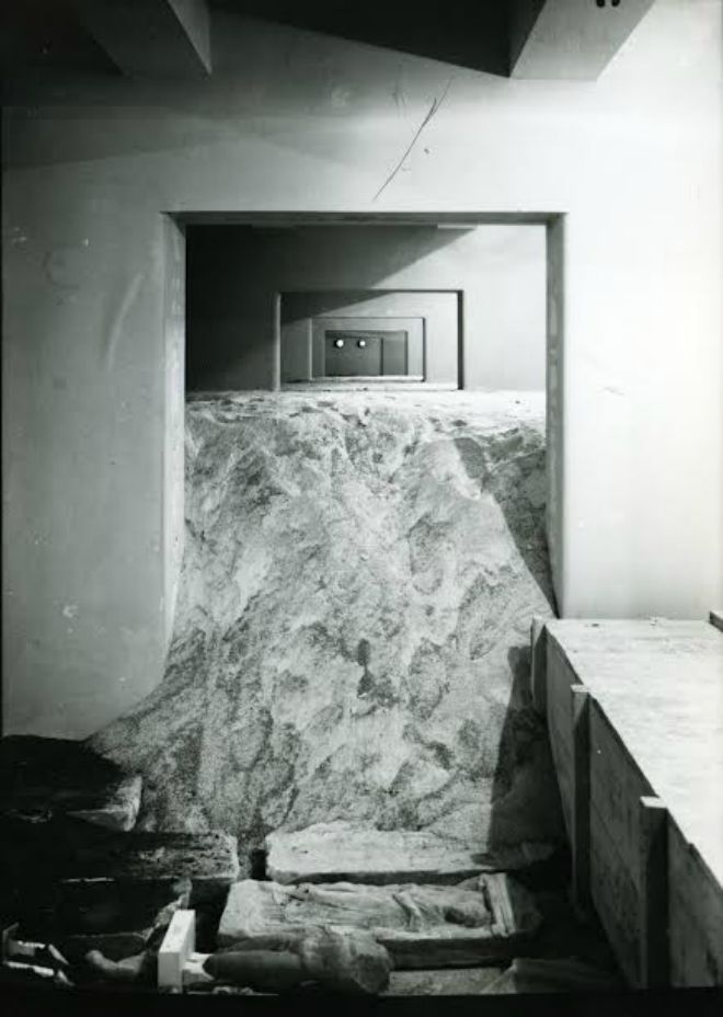 Στην νέα πτέρυγα, εγκιβωτιάστηκαν και θάφτηκαν μικρά αντικείμενα (πήλινα, αγγεία, ειδώλια, αντικείμενα από γυαλί κ.α.). Τα κιβώτια που τα περιείχαν καλύφθηκαν με άμμο σε ύψος 3-4 μέτρων δίνοντας στις αίθουσες του μουσείου εικόνες όπως η πιο πάνω. Η λογική της κίνησης αυτής ήταν πέρα από την δυσχέρεια ανεύρεσης τους και η προστασία από αεροπορικές επιθέσεις ή από μάχες που μπορεί να δίνονταν στους χώρους γύρω από το Μουσείου (σ.σ. σε άλλη φωτογραφία που φιλοξενείται στην έκθεση φαίνονται ζημιές που έχει υποστεί το κτίριο του Μουσείου κατά την διάρκεια του Εμφυλίου).